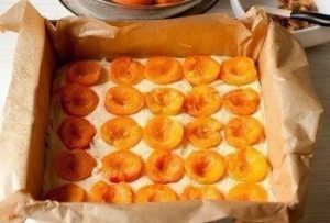 4. Абрикосы разрезаем на половинки и удаляем косточки. Кладем половинки абрикосов на тесто. Если они недостаточно сладкие, немного посыпаем сахаром.