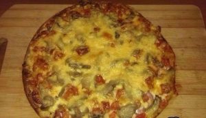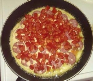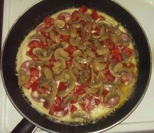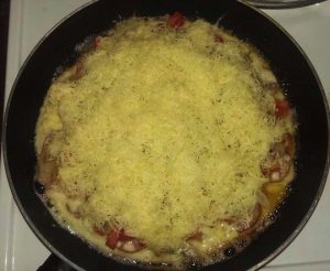Смешиваем тесто и выливаем его на сковороду, укладываем начинку и посыпаем натертым сыром. Ставим в духовку на 5-10 минут до золотистой корочки.