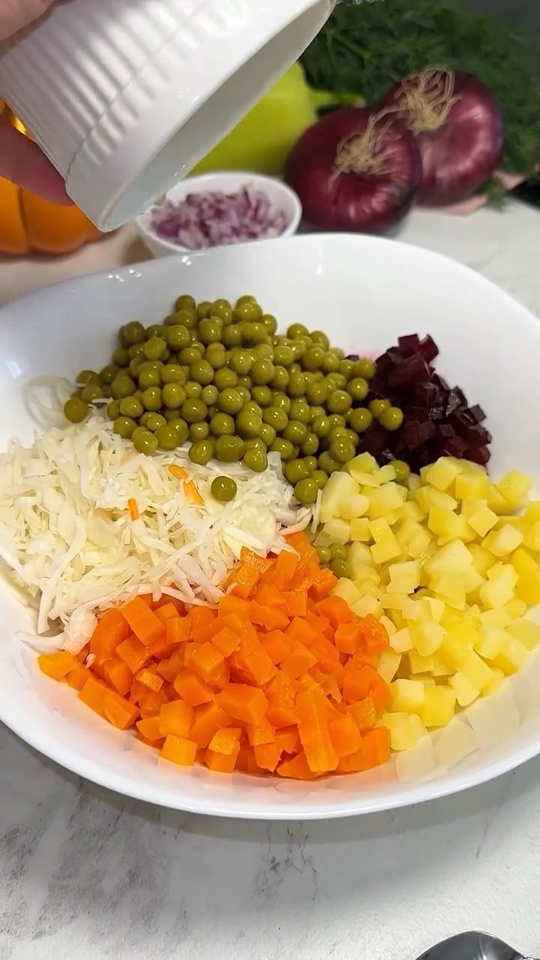 Ингредиенты: - 2 свеклы - 2 картофелины - 1 морковь - 100 г квашеной капусты - 200-250 г консервированного горошка (1 банка) - 1 луковица (у меня сладкий сорт для…[...]