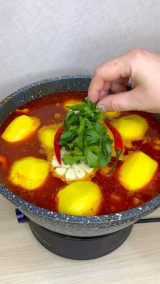 Составляющие: - Мясо - Картошка - Перец болгарский - Томат - Морковь - Лук репчатый - Чеснок - Острый перец Чили - Зелень - Кориандр - Паприка - Зира Создатель…[...]