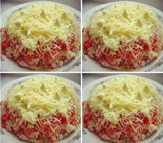 Ингредиенты: 200 граммов крабовых палочек, 2 помидора, 1 салатный перец, 100 граммов сыра, 2 яйца. ПРИГОТОВЛЕНИЕ: Натереть сыр и яйца на мелкой терке, остальные ингредиенты нарезать кубиками. Каждый слой немного…[...]