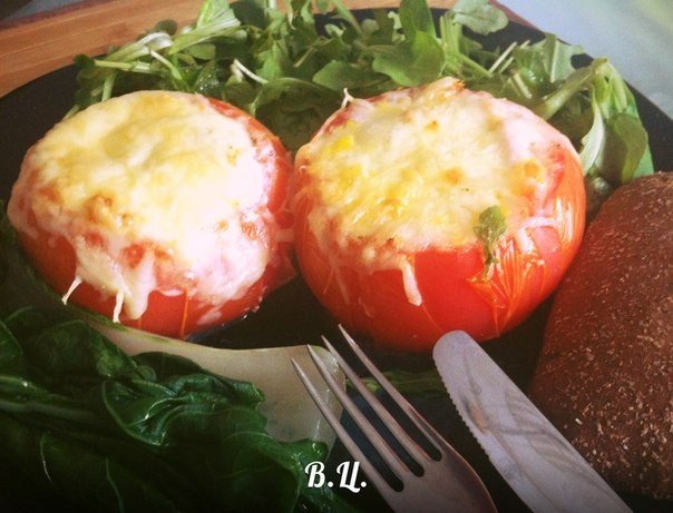 "Замечательный завтрак!" Ингредиенты: для 2 крупных помидоров: 50 г ветчины, 50 г сыра, 2 яйца, соль, перец. Способ приготовления: у помидоров аккуратно отрезать верхушку и извлечь мякоть ложкой. Получившиеся "чашечки"…[...]