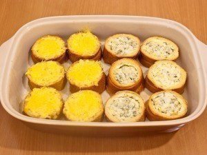 Запекать при 180 градусах в течение 40–45 минут. После этого посыпать сыром (я часть гнездышков посыпала, часть – нет) и вернуть в духовку еще на 5–7 минут. Мне понравились гнездышки как с сыром, так и без.