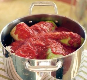 7. Выложите первый слой голубцов и полейте половиной соуса. Затем снова уложите слой капусты, остальные голубцы и оставшийся томатный соус. Накройте кастрюлю крышкой, доведите до кипения, затем уменьшите огонь и готовьте 2-2,5 часа.
