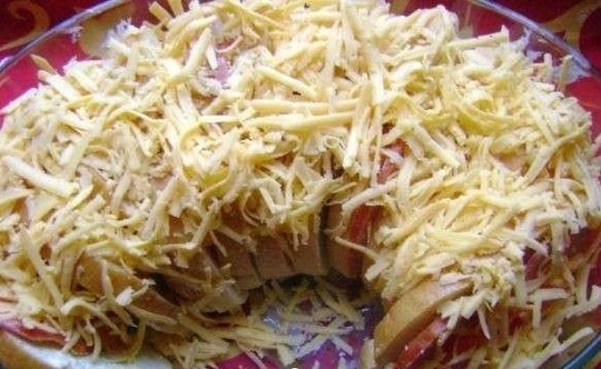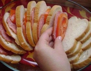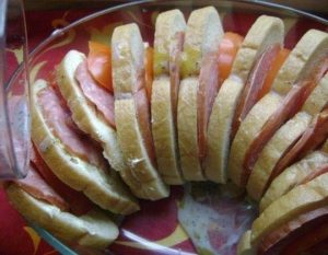 Нарезаем сервелат. Помидоры также нарезаем аналогично. На крупной терке трем сыр. Наносим масло на хлеб равномерно. Чтобы избежать лишних калорий, я сама иногда обходилась без масла. Укладываем хлеб в форму, которую предварительно смазали сливочным маслом.