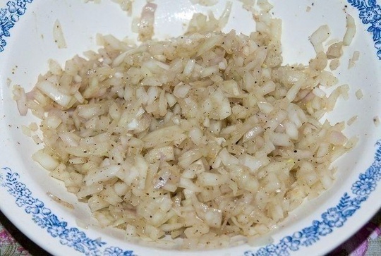 2. Для начинки: в говяжий фарш добавьте нарезанный лук и мелко порубленную зелень. Приправьте солью и перцем, влейте 1/2 стакана воды и тщательно перемешайте до однородности.