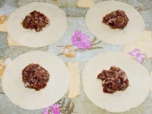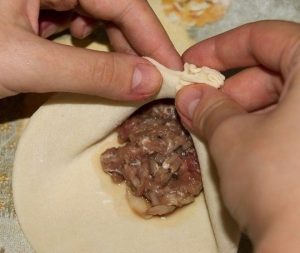 4. Возьмите один кусочек теста и раскатайте его до размера чайного блюдца. В центр положите столовую ложку начинки, поднимите края теста и тщательно соедините их в верхней части хинкали. Повторите с остальными кусочками.