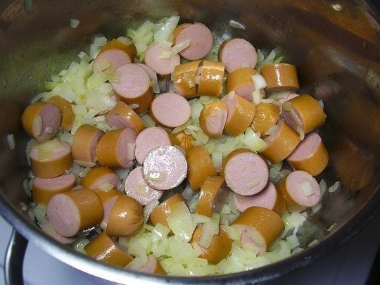 В кастрюле обжарьте сосиски и лук до мягкости. Сосиски обжаривать до прозрачности необязательно.