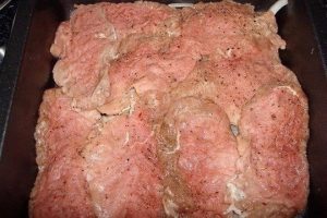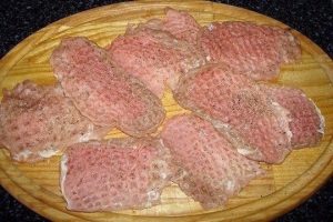 Сначала нарезаем мясо на кусочки толщиной около 1 см и слегка отбиваем. Затем каждую часть присаливаем и поперчим.