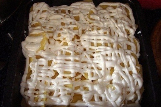 Остатки лука покрываем майонезом, затем выкладываем картофель, тоже обмазываем его майонезом и солим. Ставим в разогретую до 175 градусов духовку на 1-1,5 часа. За 15 минут до окончания приготовления посыпаем картошку тертым сыром.