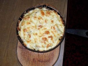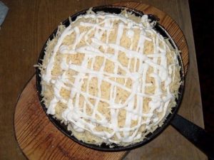 В завершение добавляем слой майонеза. Рекомендуется использовать майонез с низким содержанием жира, так как более насыщенный в духовке может не расплавиться и превратиться в неаппетитные кусочки. После завершения всех приготовлений отправляем наше блюдо в духовку на 60 минут при температуре 230 градусов. Когда картошка почти готова, появится румяная корочка. Проверка готовности может быть произведена при помощи спички — если картошка легко протыкается, значит она готова.