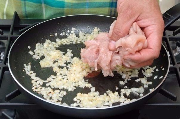 1. Разогреваем на сковороде сливочное масло и немного обжариваем мелко нарезанный лук, добавив порезанное куриное филе, прогреваем 3–5 минут, затем выкладываем соломкой нарезанный перец, солим, готовим еще 2–3 минуты.