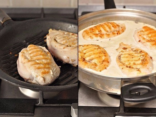 5. На сковороде-гриль или обычной сковороде на среднем огне разогрейте пару столовых ложек растительного масла и обжарьте фаршированное филе с обеих сторон до золотистого цвета. В другом сотейнике с оставшимися грибами влейте сливки, доведите до кипения, добавьте соль и перец по вкусу, положите туда обжаренные куриные грудки и тушите под крышкой 10 минут.