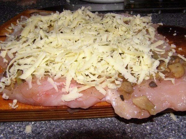 Грудки аккуратно отбить, приправить солью и перцем. Грибы и лук мелко нарезать, обжарить на сковороде, слегка посолив и поперчив. Дать смеси остыть. В отдельной миске объединить сметану, укроп и чеснок для соуса. На отбивные выложить обжаренные грибы с луком, посыпать тертым сыром, свернуть в рулетики и закрепить зубочистками. Обжарить рулетики на сковороде в масле с обеих сторон до золотистой корочки.