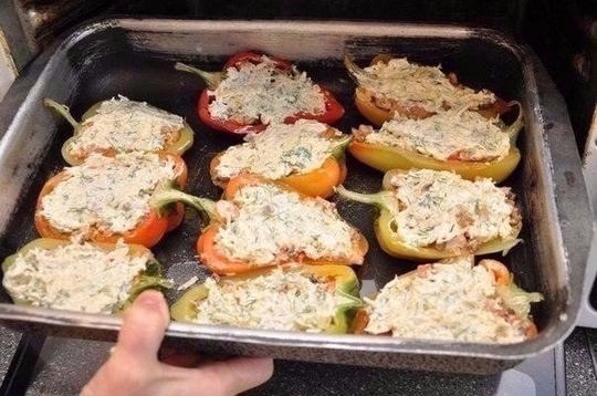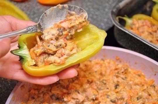 7. На противень выкладываем половинки перца и начиняем их получившимся фаршем.