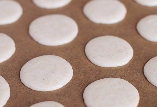 Застилаем противень пергаментом, а с помощью кондитерского мешка формируем круглые печенья размером 4 см в диаметре. Оставляем их на 30-40 минут до подсыхания. Разогреваем духовку до 150 градусов и выпекаем 8-10 минут. После этого даем остыть.