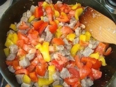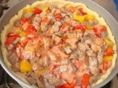 Ингредиенты для начинки: 500 г свинины (либо мясного фарша), 2 болгарских перца, 1 помидор, 2 небольшие луковицы, 100 мл жирных сливок (33-38%), 100 мл молока, 2 небольших яйца (для заливки), 2 ст.л. томатной пасты, соль, перец, немного натертого сыра.