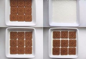 Процесс создания торта из печенья без выпечки достаточно прост. Самое трудное в этом рецепте — выбрать печенье без искусственных добавок и консервантов. Нужно взять форму прямоугольной формы с бортиками. Готовим крем: в зависимости от желатина, высыпаем ложку его в воду и даём постоять несколько минут для набухания. После этого ставим его на минимальный огонь, где он быстро растворится. Процеживаем и откладываем в сторону.