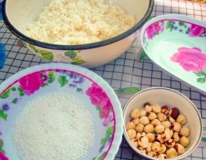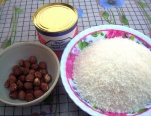 Переходи к формированию конфет. Насыпь кокосовую стружку в отдельную емкость, приготовь место для готовых конфет и под рукой держи сладкую массу с орехами.