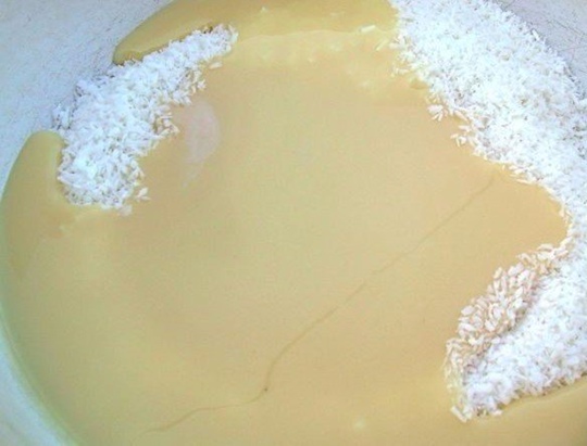 Помести кокосовую стружку в глубокую миску и добавь туда сгущенное молоко.