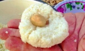 Сформируй из сладкой массы небольшую лепешку, вложи в центр орех и, сжимая ладонь, скатай в шарик.