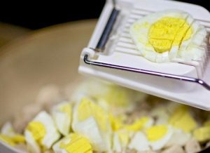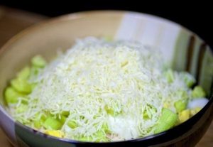 1. Отвариваем куриное филе в подсоленной воде в течение 20 минут, затем даем остыть. Яйца варим и очищаем. Сыр трем на терке.
