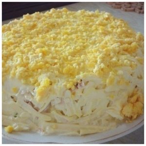 2. Выкладывайте ингредиенты слоями, промежутки между слоями смазывая майонезом.