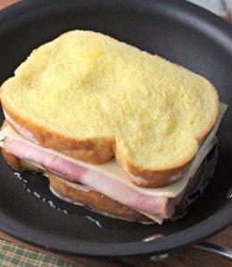 2. На обе половинки положи по ломтику сыра и ветчины, совмести их.