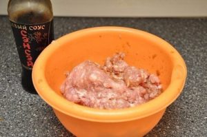 Лук натрем на терке (возможно, пропустим через мясорубку) и добавим в фарш. Затем вливаем соевый соус, добавляем перец и рубленный чеснок. Если потребуется, слегка подсолим, учитывая, что соевый соус уже содержит соль. Фарш хорошо перемешиваем и оставляем в холодильнике на полчаса.
