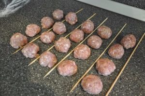 После этого формируем фрикадельки – по 4 на каждую шпажку. Одна фрикаделька будет весить 25 г, а на шпажке получится 100 г.