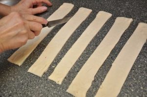 Тесто раскатываем в прямоугольник и нарезаем на полоски, ширина которых чуть больше диаметра фрикаделек.