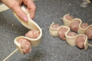 Шпажки заранее замачиваем в воде на пару минут, затем нанизываем на них фрикадельки и обвиваем их тестом в виде ленточек.