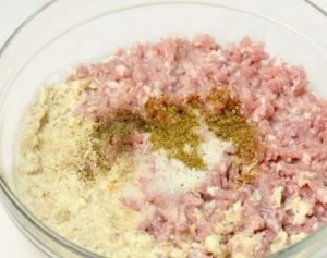 1. Фарш для шницелей готовится аналогично котлетам. Сначала батон замачиваем в молоке. Для фарша лучше использовать черствый батон, иначе шницели могут получиться кислыми. Прокручиваем мясо, батон и лук через мясорубку, добавляем специи: соль, перец, хмели-сунели и молоко от замоченного батона. Тщательно перемешиваем и вводим яйцо, после чего снова перемешиваем.