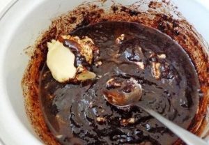 2. Сахар, молоко, какао и сгущенное молоко смешиваем, подогреваем в кастрюле, постоянно помешивая, пока сахар не растворится, остужаем немного. Далее добавляем сливочное масло и тщательно перемешиваем до однородного состояния.