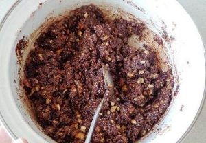 3. Постепенно добавляем в получившуюся массу орехи и печенье.