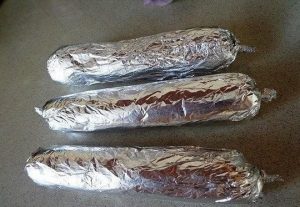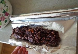 4. В итоге у нас получается сладкая масса. Формируем из части массы колбаску, выкладывая на фольгу.