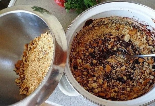 3. Постепенно добавляем в получившуюся массу орехи и печенье.