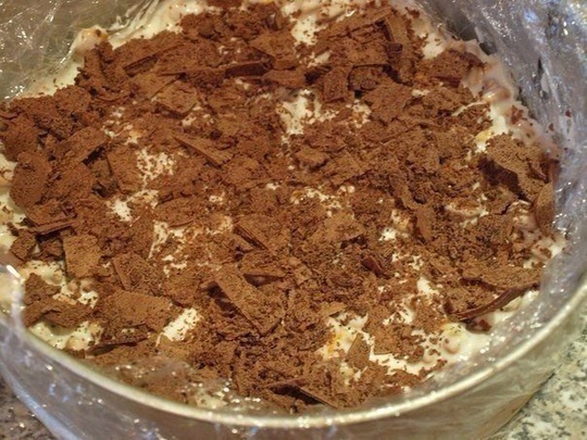 3. В разъемную форму уложите пищевую пленку. Натрите шоколад. Сформируйте торт, выкладывая сметанную массу слоями, просыпая каждый слой шоколадом. Поместите в холодильник на 1-2 часа.
