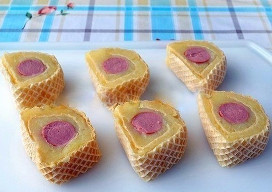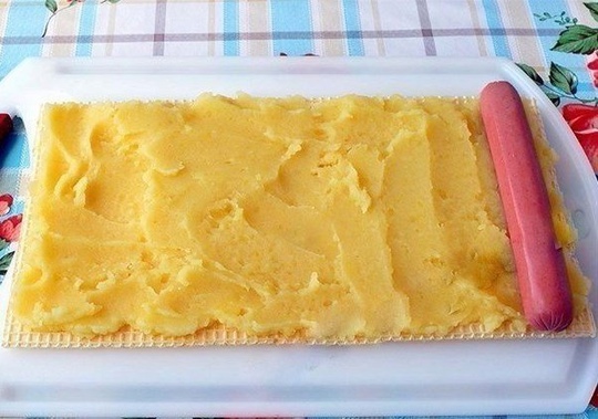 Очистите картофель, нарежьте его кубиками и отварите с добавлением небольшого количества соли, затем разомните. По желанию добавьте немного сливочного масла. Пюре должно быть не слишком сухим, а пластичным. Откройте упаковку круговых вафель для торта (или воспользуйтесь прямоугольными, так будет удобнее), и разложите их на разделочной доске. Намажьте вафли горячим картофельным пюре и дайте им немного пропитаться, следя за тем, чтобы не передержать, иначе они могут развалиться. Сосиски промойте и снимите с них оболочку. Выложите сосиски на подготовленные «пирожные» из вафель и сверните в трубочку. Нарежьте полученные трубочки на кусочки по 3 см. В отдельной миске взбейте яйцо с небольшим количеством соли, обваляйте в нем трубочки и обжарьте их на растительном масле до готовности. Подавайте блюдо горячим, украсив зеленью и посыпав тертым твердым сыром. Приятного аппетита!