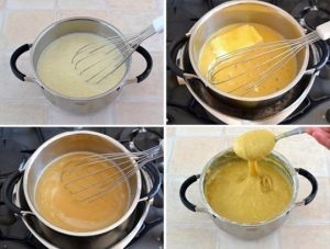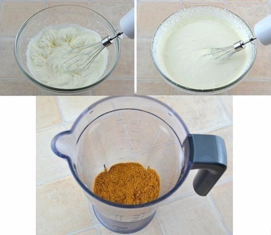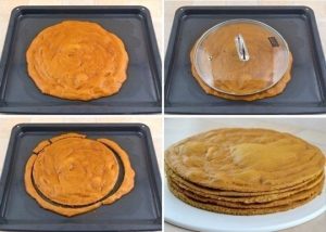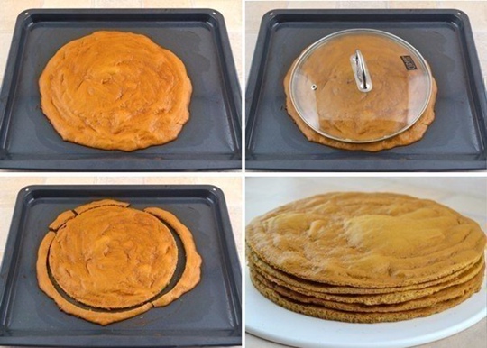 Пока корж теплый, обрезаем его по крышке. Если края не острые, используйте нож для обрезки. Затем печем остальные коржи (всего получается 5 штук). Не забывайте смазывать противень маслом. Удобнее выпекать на двух противнях: пока один печется, другой растягивайте. Из оставшихся обрезков делаем крошку с помощью блендера или вручную.