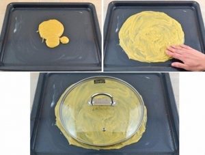 Берем крышку от кастрюли или большую тарелку диаметром около 25 см. Легкими движениями растягиваем тесто в круг. Оно может прилипать к рукам – это допустимо. Расстилаем чуть больше, чем крышка, чтобы обеспечить хорошую форму коржа.