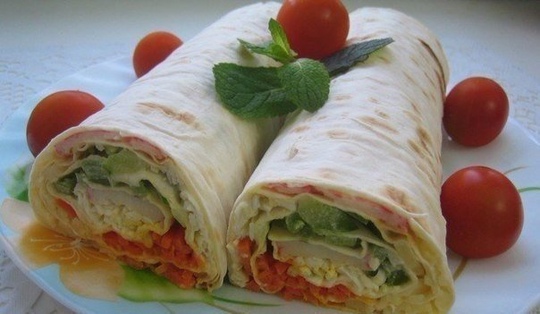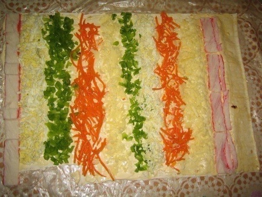 Разложите лаваш и намажьте его майонезом или сметаной. В первом ряду разместите крабовые палочки, затем яйцо, за ним перец, после морковь, сыр, а потом снова повторите слои в произвольном порядке. В конце уложите крабовые палочки.