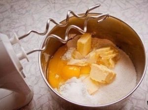 1. Смешать муку, разрыхлитель, сахар, ванилин, яйца, масло и замесить тесто.