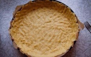 4. В форму, выстеленную пекарской бумагой, руками выложить тесто и принести в плотный вид. Форму лучше взять с краями, иначе начинка может вытечь. Для предотвращения поднятия теста его нужно проколоть вилкой.