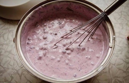 6. Чтобы приготовить начинку: творог, сахар, ванилин, сливки и чернику аккуратно перемешать венчиком.