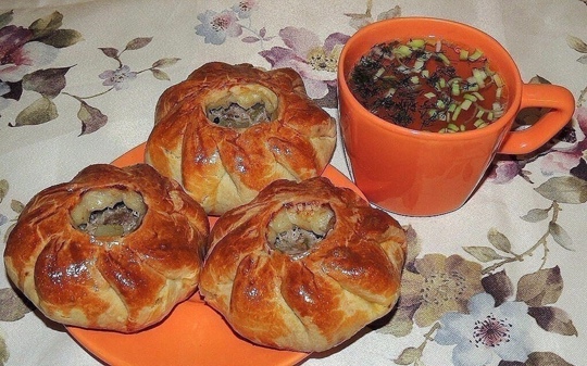 4. Выкладываем пироги на противень с бумагой, смазываем взбитым яйцом и ставим в разогретую до 180°C духовку на 20 минут. Затем выливаем в отверстия бульон и запекаем еще 40 минут.