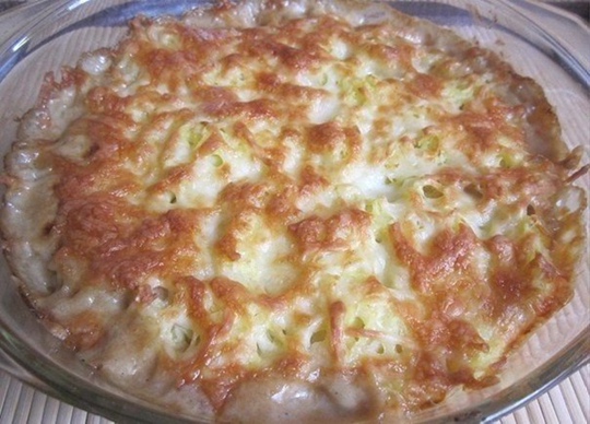 5. Перекладываем в форму для запекания куриное мясо с грибами, сверху укладываем картошку и посыпаем натертым сыром.